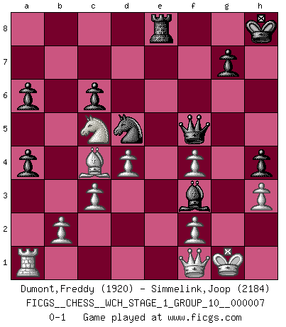 Last move : 0-1 2010 January 6 20:30:25 [Event "FICGS__CHESS__WCH_STAGE_1_GROUP_10__000007"] [Site "FICGS"] [Date "2009.11.02"] [Round "1"] [White "Dumont,Freddy"] [Black "Simmelink,Joop"] [Result "0-1"] [WhiteElo "1920"] [BlackElo "2184"] 1.e4 Nc6 2.Nf3 e5 3.Bb5 a6 4.Ba4 Nf6 5.O-O Be7 6.Re1 b5 7.Bb3 O-O 8.c3 d5 9.exd5 Nxd5 10.Nxe5 Nxe5 11.Rxe5 c6 12.d4 Bd6 13.Re1 Qh4 14.g3 Qh3 15.Qe2 Bg4 16.Qf1 Qh5 17.Nd2 Rae8 18.Ne4 Bc7 19.Bd2 f5 20.Nc5 f4 21.Bxf4 Bxf4 22.Rxe8 Rxe8 23.gxf4 Bf3 24.h3 Qf5 25.a3 h5 26.a4 bxa4 27.Ba2 h4 28.Bc4 Kh8 0-1 This chess game has been lost on time (started : 2009.11.02 22:29:38) KP : Nimzovich defense Kingside Castling by player White (move 5) Kingside Castling by player Black (move 7) Player Black won this chess game. Follow this game move after move (download)Chess is in its essence a game, in its form an art, and in its execution a science. (Baron Tassilo) Zum Sieg gelangt man nicht, wenn man gut, sondern nur wenn man besser spielt (Savielly Grigorievitsch Tartakower) Un jugador que trata de regresar una movida en el Ajedrez es un futuro carterista. (Richard Fenton) Je fais ceci parce que dans cinquante coups j'obtiendrai cela; je m'appelle Mikhail Moisevitch Botvinnik. (Botvinnik) Creativity is allowing yourself to make mistakes. Art is knowing which ones to keep. (Scott Adams)