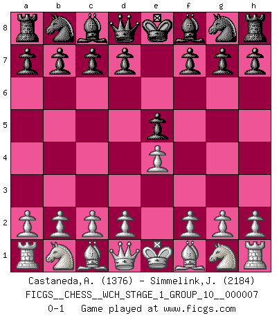 Last move : 0-1 2009 December 4 8:56:40 [Event "FICGS__CHESS__WCH_STAGE_1_GROUP_10__000007"] [Site "FICGS"] [Date "2009.11.02"] [Round "1"] [White "Castaneda,Alfredo"] [Black "Simmelink,Joop"] [Result "0-1"] [WhiteElo "1376"] [BlackElo "2184"] 1.e4 e5 0-1 This chess game has been lost on time (started : 2009.11.02 22:29:38) King's pawn game Player Black won this chess game. Follow this game move after move (download)A man that will take back a move at Chess will pick a pocket. (Richard Fenton) Computer sind die einzigen Gegner, die nicht immer eine Ausrede auf Lager haben, wenn sie gegen mich verlieren. (Robert James Fischer) Ciertamente el estado mental actual de Bobby Fischer es una tragedia. Uno de los mas grandes jugadores de Ajedrez del mundo -el orgullo y pena del Ajedrez Americano. (Frank Brady) Les échecs sont un jeu terrible. Si vous n'avez pas le centre, votre adversaire a une position plus libre. Par contre, si vous avez le centre, alors vous avez vraiment quelque chose pour laquelle vous inquiéter ! (Siegbert Tarrasch) There is far too much law for those who can afford it and far too little for those who cannot. (Derek Bok)