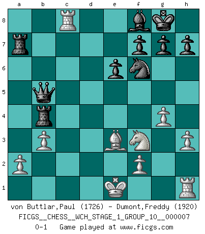 Last move : 0-1 2010 January 11 8:11:21 [Event "FICGS__CHESS__WCH_STAGE_1_GROUP_10__000007"] [Site "FICGS"] [Date "2009.11.02"] [Round "1"] [White "von Buttlar,Paul"] [Black "Dumont,Freddy"] [Result "0-1"] [WhiteElo "1726"] [BlackElo "1920"] 1.c4 Nf6 2.Nc3 d5 3.d4 c6 4.Nf3 e6 5.e3 Nbd7 6.Bd3 dxc4 7.Bxc4 b5 8.Bd3 a6 9.e4 c5 10.e5 cxd4 11.Nxb5 Nxe5 12.Nbxd4 Qa5+ 13.Kf1 Nxd3 14.Qxd3 Bb7 15.Be3 Rd8 16.Qb3 Rd7 17.Rc1 Bd6 18.Bd2 Qh5 19.h3 O-O 20.Be3 Rfd8 21.Ke2 Bd5 22.Qa4 Rb7 23.b3 Rb4 24.Qxa6 Bb7 25.Qa7 Rd7 26.g4 Bxf3+ 27.Nxf3 Qb5+ 28.Ke1 Rxa7 29.Rc8+ Bf8 0-1 English : Anglo-Gruenfeld defense Kingside Castling by player Black (move 19) Player Black won this chess game. Follow this game move after move (download)It's just you and your opponent at the board and you're trying to prove something. (Bobby Fischer) Korrekt heißt in Deutschland die Haltung eines Mannes, dessen Benehmen nach dem Urteile seiner Nachbarn seiner Stellung angemessen ist. Um korrekt zu sein, muß man sich der Meinung der anderen anpassen... (Emanuel Lasker) Los asuntos humanos son como una partida de Ajedrez: solo aquellos que no lo toman seriamente, pueden ser llamados buenos jugadores. (Hung Tzu Ch'eng) Le moment que je préfère le plus dans une rencontre, c'est celui où je sens que la personnalité de l'adversaire se brise. (Robert Fischer) I live to kill Traxler counterattack. (Ilmars Cirulis)