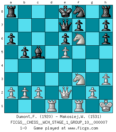 Last move : 1-0 2009 December 29 20:56:48 [Event "FICGS__CHESS__WCH_STAGE_1_GROUP_10__000007"] [Site "FICGS"] [Date "2009.11.02"] [Round "1"] [White "Dumont,Freddy"] [Black "Makosiej,Wladyslaw"] [Result "1-0"] [WhiteElo "1920"] [BlackElo "1531"] 1.e4 c5 2.Nf3 d6 3.d4 cxd4 4.Nxd4 Nf6 5.Nc3 a6 6.Be2 Nbd7 7.O-O e6 8.f4 b5 9.Bf3 Bb7 10.e5 Bxf3 11.Nxf3 dxe5 12.fxe5 Ng4 13.Qe2 Be7 14.h3 Bc5+ 15.Kh1 Nh6 16.Bxh6 gxh6 17.Rad1 Qe7 18.Ne4 Nf8 19.Nf6+ 1-0 Sicilian : Najdorf, Opovcensky variation Kingside Castling by player White (move 7) Player White won this chess game. Follow this game move after move (download)Chess is a terrible game. If you have no center, your opponent has a freer position. If you do have a center, then you really have something to worry about ! (Siegbert Tarrasch) Wenn ich einen Club besuche, sind die Spieler stumm vor Staunen. (José Raúl Capablanca) Nos gusta pensar. (Gary Kasparov) Les échecs c'est le défi de l'alpiniste, toujours plus haut, prêt à tout pour monter à l'assaut du Roi ennemi. Les échecs, c'est de la musique en mouvement, un ballet majestueux pour les yeux. C'est de la poésie composée par les fantômes du passé qui au même titre que Rimbaud ou Verlaine méritent notre admiration. Les échecs, c'est de la peinture ou le moindre mouvement modifie le tableau pour en faire un Picasso ou un Van Gogh. Les échecs, c'est tout et rien, c'est la vie et la mort. Jjulie33 sur le forum de France-Echecs. Treat your password like your toothbrush. Don't let anybody else use it, and get a new one every six months. (Clifford Stoll)