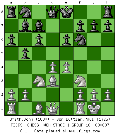 Last move : 0-1 2009 December 19 19:53:56 [Event "FICGS__CHESS__WCH_STAGE_1_GROUP_10__000007"] [Site "FICGS"] [Date "2009.11.02"] [Round "1"] [White "Smith,John"] [Black "von Buttlar,Paul"] [Result "0-1"] [WhiteElo "1800"] [BlackElo "1726"] 1.d4 d5 2.c4 e6 3.Nc3 c6 4.e3 Nf6 5.Nf3 Bd6 6.Bd3 dxc4 7.Bxc4 b5 8.Bd3 Bb7 9.e4 Bc7 10.O-O a6 0-1 This chess game has been lost on time (started : 2009.11.02 22:29:38) QGD : Semi-Slav Kingside Castling by player White (move 10) Player Black won this chess game. Follow this game move after move (download)One bad move nullifies forty good ones. (Horowitz) Wenn du nicht weißt was du tun sollst, warte bis dein Gegner eine Idee hat. Sie wird sicher schlecht sein. (Siegbert Tarrasch) Los Peones son nacidos libres, y aún así, se encuentran por doquier encadenados. (Rick Kennedy) Les échecs, c'est la lutte contre l'erreur. (Johannes Zukertort) Horse racing is animated roulette. (Roger Kahn)
