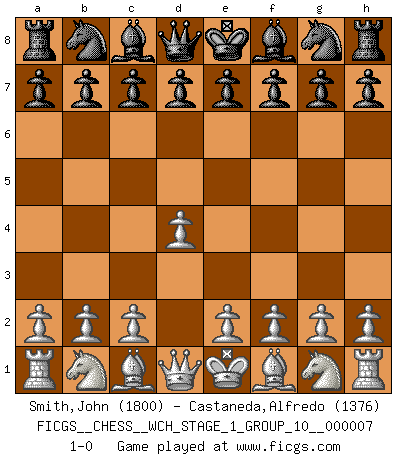 Last move : 1-0 2009 December 3 8:52:18 [Event "FICGS__CHESS__WCH_STAGE_1_GROUP_10__000007"] [Site "FICGS"] [Date "2009.11.02"] [Round "1"] [White "Smith,John"] [Black "Castaneda,Alfredo"] [Result "1-0"] [WhiteElo "1800"] [BlackElo "1376"] 1.d4 1-0 This chess game has been lost on time (started : 2009.11.02 22:29:38) Queen's pawn Player White won this chess game. Follow this game move after move (download)A thorough understanding of the typical mating continuations makes the most complicated sacrificial combinations leading up to them not only not difficult, but almost a matter of course. (Siegbert Tarrasch) Ich hatte Zahnschmerzen im ersten Spiel. In der zweiten Partie tat mir der Kopf weh. In der dritten war es eine Rheuma-Attacke und während der vierten fühlte ich mich nicht gut. Und in der fünften? Nun, man muss doch nicht jedes Spiel gewinnen, oder? (Savielly Grigorievitsch Tartakower) El hombre es un frívolo, una creatura engañosa y como un jugador de Ajedrez, se preocupa mas por el proceso de obtener su meta que de la meta por sí misma. (Dostoyevsky) Ce qui caractérise les parties de combat, c'est que si le défenseur a constamment de difficiles problèmes à résoudre, l'attaquant doit chercher sans relâche de nouvelles possibilités d'attaque. (Koblentz) Once you start thinking you have nothing left to learn, you have everything to learn. (Steve Badget)