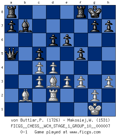 Last move : 0-1 2009 December 21 14:9:2 [Event "FICGS__CHESS__WCH_STAGE_1_GROUP_10__000007"] [Site "FICGS"] [Date "2009.11.02"] [Round "1"] [White "von Buttlar,Paul"] [Black "Makosiej,Wladyslaw"] [Result "0-1"] [WhiteElo "1726"] [BlackElo "1531"] 1.c4 e6 2.d4 f5 3.Nc3 Nf6 4.Nf3 Bb4 5.a3 Bxc3+ 6.bxc3 O-O 7.e3 b6 8.Bd3 Bb7 9.O-O Ne4 10.Qc2 d6 11.a4 Nd7 12.a5 bxa5 13.Rxa5 Ndf6 14.Bb2 Ng4 15.h3 Ngf6 16.Nd2 Nxd2 17.Qxd2 Ne4 18.f3 Nxd2 19.Rf2 c5 20.Rxd2 Qxa5 0-1 English Opening Kingside Castling by player Black (move 6) Kingside Castling by player White (move 9) Player Black won this chess game. Follow this game move after move (download)It is always better to sacrifice your opponent's men. (Savielly Tartakower) Wenn Spassky eine Figur opfert kannst du genauso gut aufgeben. Aber wenn Tal eine Figur opfert, spiel weiter. Er könnte noch eine weitere opfern, und dann ... wer weiß? (Miguel Najdorf) El estómago es una parte esencial del maestro de Ajedrez. (Bent Larsen) On n'a jamais que l'âge auquel on a commence à jouer aux échecs car après on cesse de vieillir. (Capablanca) There will be no order, only chaos. (Sol Robeson in Pi by Darren Aronofsky)