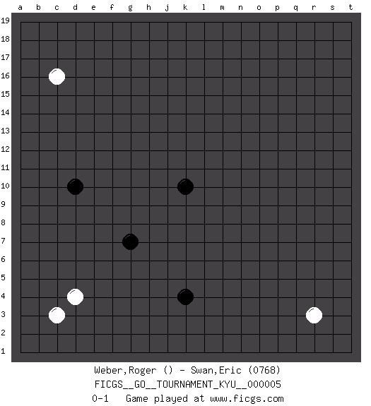 Last move : 0-1 2006 November 16 5:16:0 [Event "FICGS__GO__TOURNAMENT_KYU__000005"] [Site "FICGS"] [Date "2006.10.02"] [Round "1"] [Black "Weber,Roger"] [White "Swan,Eric"] [Result "0-1"] [Rating 2 "0768"] 1.k10 d4 2.k4 c16 3.d10 r3 4.g7 c3 0-1 This go game has been lost on time (started : 2006.10.02 11:48:46) Here are the names of the openings (joseki) played in the four corners : Corner d4 : d4 g7 Hoshi (Hwajeom, Seongjeom, Xingwei`) 4-4 Point. The star or hoshi (4-4) point, emphasizing influence at the potential expense of territory. Player White won this Go (weiqi, baduk) game. Follow this game move after move (download)When your opponent has two weak groups, attack them both at once. (Anonymous) Strategy without tactics is the slowest route to victory. Tactics without strategy is the noise before defeat. (Sun Tzu)