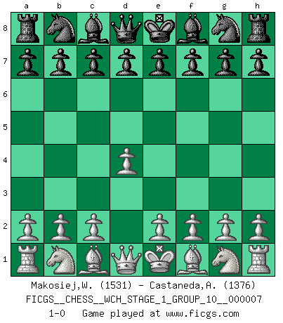 Last move : 1-0 2009 December 3 20:53:45 [Event "FICGS__CHESS__WCH_STAGE_1_GROUP_10__000007"] [Site "FICGS"] [Date "2009.11.02"] [Round "1"] [White "Makosiej,Wladyslaw"] [Black "Castaneda,Alfredo"] [Result "1-0"] [WhiteElo "1531"] [BlackElo "1376"] 1.d4 1-0 This chess game has been lost on time (started : 2009.11.02 22:29:38) Queen's pawn Player White won this chess game. Follow this game move after move (download)The battle for the ultimate truth will never be won. And that's why Chess is so fascinating. (Hans Kmoch) Die starken Figuren des Gegners muss man abtauschen. (José Raúl Capablanca) Fischer es una tragedia del Ajedrez Americano a la par con Morphy y Pillsbury. (Mig Greengard) Même si l'adversaire joue le coup analysé précédemment, recommencez l'analyse en voyant la nouvelle position. Première règle de Blumenfeld There are two kinds of tragedy in this world, one is not getting what you want and the other is getting. (Lord of war)
