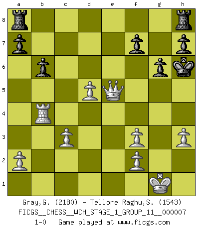 Last move : 1-0 2010 January 20 16:34:3 [Event "FICGS__CHESS__WCH_STAGE_1_GROUP_11__000007"] [Site "FICGS"] [Date "2009.11.02"] [Round "1"] [White "Gray,Garvin"] [Black "Tellore Raghu,Shyam Sundar"] [Result "1-0"] [WhiteElo "2180"] [BlackElo "1543"] 1.d4 d5 2.c4 dxc4 3.e3 e5 4.Bxc4 Nc6 5.Nf3 Bb4+ 6.Nc3 exd4 7.exd4 Bg4 8.O-O Bxc3 9.bxc3 Qd7 10.Re1+ Nge7 11.h3 Bh5 12.Rb1 Na5 13.Ba3 Nxc4 14.Rxe7+ Qxe7 15.Bxe7 Kxe7 16.Qe2+ Kf8 17.Qxc4 Bxf3 18.gxf3 b6 19.Qxc7 g6 20.d5 Kg7 21.Qe5+ Kh6 22.Rb4 1-0 Queen's gambit accepted Kingside Castling by player White (move 8) Player White won this chess game. Follow this game move after move (download)The hardest game to win is a won game. (Emanuel Lasker) Karpov ist ein Museumsstück. (Garry Kasparov) ¡Examina movidas que hagan daño! Un buen ojo for movidas desvastantes es mucho mas importante que el conocimiento de principios estratégicos. (Purdy) Les échecs sont un jeu terrible. Si vous n'avez pas le centre, votre adversaire a une position plus libre. Par contre, si vous avez le centre, alors vous avez vraiment quelque chose pour laquelle vous inquiéter ! (Siegbert Tarrasch) Drag your thoughts away from your troubles... by the ears, by the heels, or any other way you can manage it. (Mark Twain)