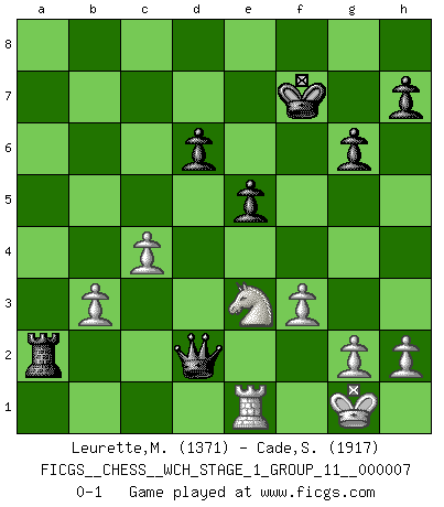 Last move : 0-1 2009 December 15 10:19:38 [Event "FICGS__CHESS__WCH_STAGE_1_GROUP_11__000007"] [Site "FICGS"] [Date "2009.11.02"] [Round "1"] [White "Leurette,Marc-Antoine"] [Black "Cade,Stephen"] [Result "0-1"] [WhiteElo "1371"] [BlackElo "1917"] 1.e4 c5 2.Nc3 a6 3.Nf3 d6 4.d4 cxd4 5.Nxd4 Nf6 6.Be3 e5 7.Nf3 Be7 8.Bc4 O-O 9.O-O Be6 10.Bd5 Bxd5 11.Nxd5 Nbd7 12.Qd3 Nxd5 13.Qxd5 Nf6 14.Qxb7 Qb8 15.Qxe7 Re8 16.Qxe8+ Qxe8 17.Rad1 Qc6 18.c4 Nxe4 19.b3 f5 20.Bd2 f4 21.Rfe1 a5 22.Nh4 a4 23.Nf5 Qb7 24.f3 Qb6+ 25.Be3 fxe3 26.Rxe3 axb3 27.axb3 g6 28.Ne7+ Kf7 29.Nd5 Qd4 30.Rf1 Nc3 31.Rfe1 Nd1 32.Kf1 Nxe3+ 33.Nxe3 Ra2 34.Kg1 Qd2 0-1 Sicilian : Closed Kingside Castling by player Black (move 8) Kingside Castling by player White (move 9) Player Black won this chess game. Follow this game move after move (download)All my games are real. (Bobby Fischer) Als ich elf wurde, wurde ich einfach gut. (Robert James Fischer) El Ajedrez es imaginación. (David Bronstein) J'ai toujours senti une vague pitié pour l'homme qui ne connaît rien aux échecs, tout comme j'en aurais pour un homme ignorant de l'amour. Les Echecs, comme la musique ou comme l'amour, ont le pouvoir de rendre heureux. (Siegbert Tarrasch) Life is like a ten-speed bicycle: most of us have gears we never use. (Charles M. Schulz)