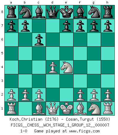 Last move : 1-0 2009 December 10 20:23:32 [Event "FICGS__CHESS__WCH_STAGE_1_GROUP_12__000007"] [Site "FICGS"] [Date "2009.11.02"] [Round "1"] [White "Koch,Christian"] [Black "Cosan,Turgut"] [Result "1-0"] [WhiteElo "2176"] [BlackElo "1550"] 1.e4 c6 2.d4 d5 3.Nc3 dxe4 4.Nxe4 1-0 This chess game has been lost on time (started : 2009.11.02 22:33:3) Caro-Kann defense Player White won this chess game. Follow this game move after move (download)Dazzling combinations are for the many, shifting wood is for the few. (Georg Kieninger) Wer nie einen Fehler gemacht hat, hat nie etwas Neues ausprobiert. (Albert Einstein) Mi estilo es algo parecido entre un poco de Tal y Petrosian. (Reshevsky) Le plus grand jeu de l'esprit jamais inventé, plus vous l'apprenez, plus vous y prenez du plaisir. (Garry Kasparov) If you ain't just a little scared when you enter a casino, you are either very rich or you haven't studied the games enough. (Pappy)