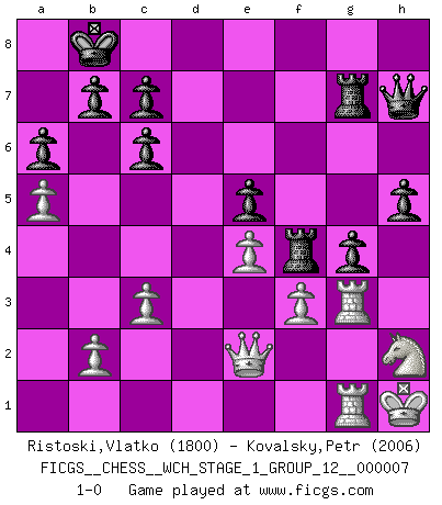 Last move : 1-0 2010 February 14 8:45:39 [Event "FICGS__CHESS__WCH_STAGE_1_GROUP_12__000007"] [Site "FICGS"] [Date "2009.11.02"] [Round "1"] [White "Ristoski,Vlatko"] [Black "Kovalsky,Petr"] [Result "1-0"] [WhiteElo "1800"] [BlackElo "2006"] 1.e4 e5 2.Nf3 Nc6 3.Bb5 a6 4.Ba4 Nf6 5.O-O Be7 6.Bxc6 dxc6 7.Nc3 Bg4 8.h3 Bh5 9.g4 Nxg4 10.hxg4 Bxg4 11.Kg2 h5 12.Qe1 Qd6 13.d3 O-O-O 14.Nh2 Be6 15.a4 Qd7 16.Rg1 g5 17.Kh1 g4 18.f3 Rhg8 19.Qf2 Kb8 20.Be3 f5 21.exf5 Bxf5 22.Rg2 Rdf8 23.Rag1 Qd6 24.Ne4 Qe6 25.Ba7+ Ka8 26.Bc5 Bd6 27.Qe3 Bxe4 28.dxe4 Bxc5 29.Qxc5 Rf4 30.Qe3 Kb8 31.Qe2 Qh6 32.a5 Rg7 33.c3 Qh7 34.Rg3 1-0 This chess game has been lost on time (started : 2009.11.02 22:33:3) Ruy Lopez : Exchange variation doubly deferred (DERLD) Kingside Castling by player White (move 5) Queenside Castling by player Black (move 13) Player White won this chess game. Follow this game move after move (download)Fischer prefers to enter Chess history alone. (Miguel Najdorf) Wenn es im Universum noch irgendwo intelligente Lebewesen gibt, dann kennen sie Go. (Emanuel Lasker) El muchacho (en ese entonces un niño de 12 años llamado Anatoly Karpov) no tiene ni idea de lo que es el Ajedrez y no hay futuro en absoluto para el en esta profesión. (Mikhail Botvinnik) On est toujours la mazette de quelqu'un d'autre. (Anonyme) Heh, heh, heh. Time to abandon ship. (General Grievous in Star Wars ep.3)