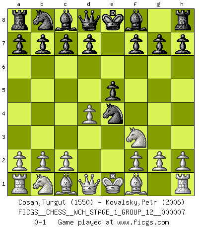 Last move : 0-1 2009 December 6 21:19:3 [Event "FICGS__CHESS__WCH_STAGE_1_GROUP_12__000007"] [Site "FICGS"] [Date "2009.11.02"] [Round "1"] [White "Cosan,Turgut"] [Black "Kovalsky,Petr"] [Result "0-1"] [WhiteElo "1550"] [BlackElo "2006"] 1.e4 e5 2.Nf3 Nf6 3.d4 Nxe4 0-1 This chess game has been lost on time (started : 2009.11.02 22:33:3) Petrov : Modern attack, Symmetrical variation Player Black won this chess game. Follow this game move after move (download)The tactician knows what to do when there is something to do; whereas the strategian knows what to do when there is nothing to do. (Gerald Abrahams) Schach verlangt totale Konzentration. (Robert James Fischer) En un gambito tu regalas un Peón por el bién de tomar un juego perdido. (Samuel Standige Boden) Celui qui prend des risques peut perdre, celui qui n'en prend pas perd toujours. (Xavier Tartacover) Somewhere in the world there is an epigram for every dilemma. (Hendrik Willem van Loon)