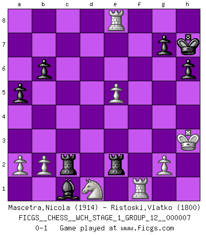 Last move : 0-1 2010 January 30 8:39:38 [Event "FICGS__CHESS__WCH_STAGE_1_GROUP_12__000007"] [Site "FICGS"] [Date "2009.11.02"] [Round "1"] [White "Mascetra,Nicola"] [Black "Ristoski,Vlatko"] [Result "0-1"] [WhiteElo "1914"] [BlackElo "1800"] 1.e4 c5 2.Nf3 d6 3.d4 cxd4 4.Nxd4 Nf6 5.Nc3 Nc6 6.Bc4 e5 7.Nf3 Be6 8.Bb3 h6 9.Be3 Be7 10.O-O O-O 11.Qe2 Na5 12.Rfd1 Ng4 13.Bc5 a6 14.Bxe6 fxe6 15.Ng5 Bxg5 16.Qxg4 Qc8 17.Bb4 Nc4 18.Rab1 a5 19.Bxd6 Rf4 20.Qh3 Nxd6 21.Rxd6 Rxf2 22.Qxe6+ Qxe6 23.Rxe6 Raf8 24.h4 Bxh4 25.Rxe5 Rxc2 26.Kh2 R8f2 27.Kh3 Bg5 28.Rg1 b6 29.Re8+ Kh7 30.e5 Bd2 31.Nd1 Re2 32.Rf1 Bc1 0-1 This chess game has been lost on time (started : 2009.11.02 22:33:3) Sicilian : Sozin, not Scheveningen Kingside Castling by player White (move 10) Kingside Castling by player Black (move 10) Player Black won this chess game. Follow this game move after move (download)In Fischer's hands, a slight theoretical advantage is as good a being a Queen ahead. (Isaac Kashdan) Wenn Dein Gegner dir ein Remis anbietet, versuch herauszufinden, weshalb er glaubt schlechter zu stehen. (Nigel Short) Tu eres para mi la Reina en d8 y yo soy el Peón en d7!!. (GM Eduard Gufeld) Le temps de noter son nom sur la feuille de partie, j'étais déjà en zeitnot ! D'un modeste amateur apparié lors de la première ronde d'un open contre le grand-maître Azmaïparashvili. I have opinions of my own - strong opinions - but I don't always agree with them. (George Bush)