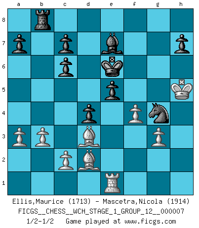 Last move : 1/2-1/2 2009 December 13 10:32:18 [Event "FICGS__CHESS__WCH_STAGE_1_GROUP_12__000007"] [Site "FICGS"] [Date "2009.11.02"] [Round "1"] [White "Ellis,Maurice"] [Black "Mascetra,Nicola"] [Result "1/2-1/2"] [WhiteElo "1713"] [BlackElo "1914"] 1.d4 d5 2.Nf3 Nf6 3.g3 g6 4.Bg2 Nc6 5.O-O Bg7 6.Nc3 O-O 7.Ne5 Rb8 8.Nxc6 bxc6 9.b3 Bf5 10.Bf4 Nh5 11.Bg5 Qd6 12.a3 e5 13.e4 dxe4 14.Nxe4 Bxe4 15.Bxe4 exd4 16.Qf3 Rfe8 17.Rfe1 Re6 18.Bd3 Nf6 19.Bf4 Qd5 20.Kg2 Qxf3+ 21.Kxf3 Nd5 22.Rxe6 fxe6 23.Bd2 Kf7 24.h4 e5 25.Re1 Bf6 26.Kg4 Ke6 27.h5 gxh5+ 28.Kxh5 Be7 29.f4 Nf6+ 30.Kh6 Ng4+ 31.Kh5 Nf6+ 32.Kh6 Ng4+ 33.Kh5 1/2-1/2 Queen's pawn game Kingside Castling by player White (move 5) Kingside Castling by player Black (move 6) This chess game ended in a draw. Follow this game move after move (download)Every Pawn is a potential Queen. (James Mason) Schach ist Kampf, hauptsächlich jedoch gegen die eigenen Fehler. (Savielly Grigorievitsch Tartakower) Los Peones son el alma de una partida de Ajedrez. (Francois Andre Danican Philidor) 'L'échange des dames est un coup dur pour les deux adversaires...' Un journaliste lors d'une partie du match Spassky-Fischer The obstacle is the path. (Zen proverb)