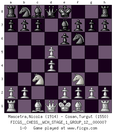 Last move : 1-0 2009 December 10 20:23:32 [Event "FICGS__CHESS__WCH_STAGE_1_GROUP_12__000007"] [Site "FICGS"] [Date "2009.11.02"] [Round "1"] [White "Mascetra,Nicola"] [Black "Cosan,Turgut"] [Result "1-0"] [WhiteElo "1914"] [BlackElo "1550"] 1.d4 d5 2.Nf3 Nf6 3.c4 e6 4.Nc3 Be7 5.cxd5 1-0 This chess game has been lost on time (started : 2009.11.02 22:33:3) Queen's pawn game Player White won this chess game. Follow this game move after move (download)Chess is like life. (Boris Spassky) Karpov ist ein Museumsstück. (Garry Kasparov) Una compensación adecuada por un sacrificio es tener una combinación sólida que conduce a una posición ganadora; una compensación adecuada por una metida de pata es dejar a tu oponente arrebatar una derrota de las fauces de la victoria. (Bruce A. Moon) J'ai toujours senti une vague pitié pour l'homme qui ne connaît rien aux échecs, tout comme j'en aurais pour un homme ignorant de l'amour. Les Echecs, comme la musique ou comme l'amour, ont le pouvoir de rendre heureux. (Siegbert Tarrasch) Cactus - It is depressed cucumber. (Ilmars Cirulis)