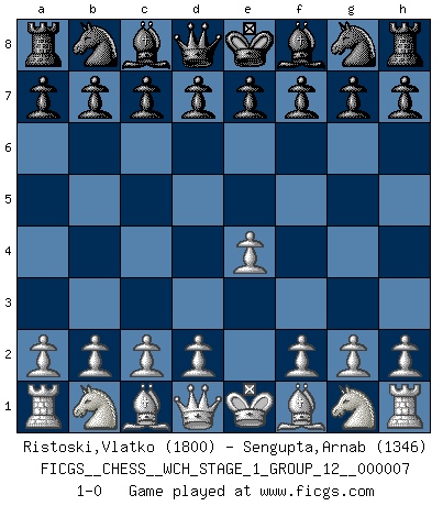 Last move : 1-0 2009 December 3 8:52:18 [Event "FICGS__CHESS__WCH_STAGE_1_GROUP_12__000007"] [Site "FICGS"] [Date "2009.11.02"] [Round "1"] [White "Ristoski,Vlatko"] [Black "Sengupta,Arnab"] [Result "1-0"] [WhiteElo "1800"] [BlackElo "1346"] 1.e4 1-0 This chess game has been lost on time (started : 2009.11.02 22:33:3) King's pawn Opening Player White won this chess game. Follow this game move after move (download)He who takes the Queen's Knight's Pawn will sleep in the streets. (Anonymous) Besser ein falscher Plan, logisch durchgeführt, als gar kein Plan. (Viktor Kortschnoi) La única cosa que los jugadores de Ajedrez tienen en común, es el Ajedrez. (Lodewijk Prins) Il n'y a plus de joueurs du niveau de Jacob Murray dont la seule quête est le beau jeu, le plaisir de voir les pièces construire quelque chose. Sur 10 idées à la minute, 9 seront sans intérêt, la dernière s'avèrera géniale. (Christian Bauer) No man has ever achieved immortality in his own life time. (Unknown)