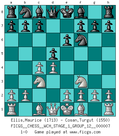Last move : 1-0 2009 December 7 21:26:12 [Event "FICGS__CHESS__WCH_STAGE_1_GROUP_12__000007"] [Site "FICGS"] [Date "2009.11.02"] [Round "1"] [White "Ellis,Maurice"] [Black "Cosan,Turgut"] [Result "1-0"] [WhiteElo "1713"] [BlackElo "1550"] 1.d4 d5 2.c4 e6 3.Nf3 Nf6 4.Nc3 1-0 This chess game has been lost on time (started : 2009.11.02 22:33:3) Queen's gambit declined Player White won this chess game. Follow this game move after move (download)Is Bobby Fischer quite sane ? (Salo Flohr) Immer nach dem besten Zug zu suchen ist ziemlich unpraktisch. (Nigel Short) Un buen sacrificio es aquel que aunque no sea necesariamente sólido, deja a tu oponente aturdido y confuso. (Rudolph Spielmann) Un millionnaire : 'Monsieur Steinitz ! Vous ne participez aux tournois que pour l'argent, alors que moi je n'y viens que pour l'honneur.' Steinitz : 'Chacun joue pour ce qu'il n'a pas'... Go and wake up your luck. (Persian saying)