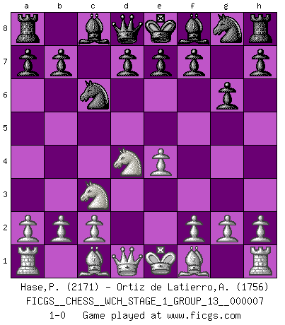 Last move : 1-0 2009 December 26 20:1:41 [Event "FICGS__CHESS__WCH_STAGE_1_GROUP_13__000007"] [Site "FICGS"] [Date "2009.11.17"] [Round "1"] [White "Hase,Pavel"] [Black "Ortiz de Latierro,Aitor"] [Result "1-0"] [WhiteElo "2171"] [BlackElo "1756"] 1.e4 c5 2.Nf3 Nc6 3.d4 cxd4 4.Nxd4 g6 5.Nc3 1-0 This chess game has been lost on time (started : 2009.11.17 23:7:42) Sicilian : Accelerated Fianchetto, Modern variation Player White won this chess game. Follow this game move after move (download)Life is like a game of Chess, changing with each move. (Chinese proverb) Computer sind die einzigen Gegner, die nicht immer eine Ausrede auf Lager haben, wenn sie gegen mich verlieren. (Robert James Fischer) El Ajedrez es imaginación. (David Bronstein) Echiquier : carré parfait, comme la Jérusalem nouvelle décrite par l'auteur de l'Apocalypse, huit cases sur huit, exaltation du chiffre 4, symbole du cosmos aux quatre horizons... où le noir et le blanc, l'ombre et la lumière, le mal et le bien s'entremêlent et se conjuguent. (Robert Couffignal, Le Gambit du poète) Question: Is 'This statement is paradoxical' a paradoxical statement ? Or is it a meta-paradox ? (Normajean Yates)