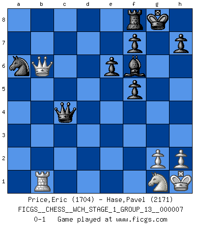 Last move : 0-1 2009 December 27 1:4:43 [Event "FICGS__CHESS__WCH_STAGE_1_GROUP_13__000007"] [Site "FICGS"] [Date "2009.11.02"] [Round "1"] [White "Price,Eric"] [Black "Hase,Pavel"] [Result "0-1"] [WhiteElo "1704"] [BlackElo "2171"] 1.e4 c5 2.Nf3 d6 3.d4 cxd4 4.Nxd4 Nf6 5.Nc3 a6 6.Bg5 e6 7.f4 b5 8.e5 dxe5 9.fxe5 Qc7 10.exf6 Qe5+ 11.Be2 Qxg5 12.Qd3 Ra7 13.Ne4 Qe5 14.Nf3 Qxb2 15.O-O Rd7 16.Qe3 Bb7 17.a4 Qb4 18.c4 Bxe4 19.Qxe4 gxf6 20.axb5 Qc5+ 21.Kh1 Bg7 22.Qg4 O-O 23.Rab1 Rd6 24.bxa6 Nxa6 25.Rb5 Qe3 26.Qg3 Qxe2 27.Qxd6 Qxf1+ 28.Ng1 f5 29.Qb6 Bf6 30.Rb1 Qxc4 0-1 Sicilian : Najdorf, Polugayevsky variation Kingside Castling by player White (move 15) Kingside Castling by player Black (move 22) Player Black won this chess game. Follow this game move after move (download)Avoid the crowd. Do your own thinking independently. Be the Chess player, not the Chess piece. (Ralph Charell) Eine Person mit durchschnittlichem IQ kann etwa eine ELO von 2000 erreichen. (Jonathan Levitt) No volvere nunca a jugar contigo. Has insultado a mi amigo. - cuando un oponente se maldijo por una mala jugada (Miguel Najdorf) Demandez au pauvre Cg1 ce qu'il en pense. Eduard Gufeld à propos de la variante Saemisch de l'Est-Indienne. Shallow men believe in luck. Strong men belive in cause and effect. (Ralph Waldo Emerson)
