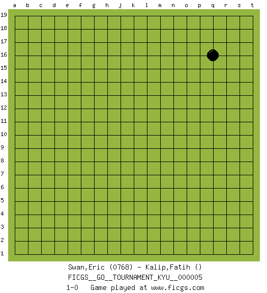 Last move : 1-0 2006 October 12 15:29:25 [Event "FICGS__GO__TOURNAMENT_KYU__000005"] [Site "FICGS"] [Date "2006.10.02"] [Round "1"] [Black "Swan,Eric"] [White "Kalip,Fatih"] [Result "1-0"] [Rating 1 "0768"] 1.q16 1-0 Here are the names of the openings (joseki) played in the four corners : Player Black won this Go (weiqi, baduk) game. Follow this game move after move (download)One big eye kills one small eye. (Anonymous) You can only get smarter by playing a smarter opponent. (Revolver, movie)