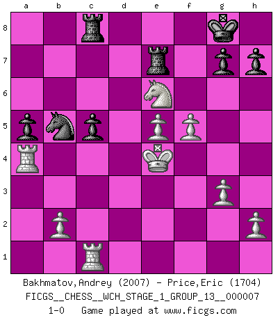 Last move : 1-0 2010 January 7 11:47:41 [Event "FICGS__CHESS__WCH_STAGE_1_GROUP_13__000007"] [Site "FICGS"] [Date "2009.11.02"] [Round "1"] [White "Bakhmatov,Andrey"] [Black "Price,Eric"] [Result "1-0"] [WhiteElo "2007"] [BlackElo "1704"] 1.e4 e5 2.Nf3 Nc6 3.Bb5 a6 4.Ba4 Nf6 5.O-O Nxe4 6.d4 b5 7.Bb3 d5 8.dxe5 Be6 9.Nbd2 Nc5 10.c3 d4 11.Bxe6 Nxe6 12.cxd4 Ncxd4 13.a4 Be7 14.Nxd4 Nxd4 15.Ne4 O-O 16.axb5 Nxb5 17.Be3 Qc8 18.Qd5 c6 19.Qc4 Qf5 20.f4 Qe6 21.Rfc1 Rfc8 22.Qxe6 fxe6 23.g3 a5 24.Ra4 Bb4 25.Kg2 Rab8 26.Kf3 Rb7 27.Bc5 Bxc5 28.Nxc5 Ra7 29.Nxe6 Re7 30.f5 c5 31.Ke4 1-0 Ruy Lopez : Open, 7.Bb3 Kingside Castling by player White (move 5) Kingside Castling by player Black (move 15) Player White won this chess game. Follow this game move after move (download)The enormous mental resilience, without which no Chess player can exist, was so much taken up by Chess that he could never free his mind of this game. (Albert Einstein) Ein Gewinn durch eine ungenaue Kombination, sei sie auch noch so vorzeigbar, erfüllt mich mit Schaudern. (Wilhelm Steinitz) No solamente yo pronostico su triunfo sobre Botvinnik, sino que me adelanto y digo que probablemente Fischer es el jugador de Ajedrez mas grande que haya existido. (John Collins) Celui qui prend des risques peut perdre, celui qui n'en prend pas perd toujours. (Xavier Tartacover) Beta. Software undergoes beta testing shortly before it's released. Beta is latin for still doesn't work. (Anonymous)
