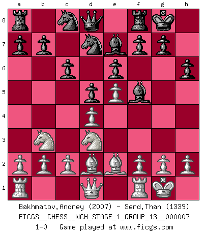 Last move : 1-0 2009 December 21 19:54:45 [Event "FICGS__CHESS__WCH_STAGE_1_GROUP_13__000007"] [Site "FICGS"] [Date "2009.11.02"] [Round "1"] [White "Bakhmatov,Andrey"] [Black "Serd,Than"] [Result "1-0"] [WhiteElo "2007"] [BlackElo "1339"] 1.e4 c6 2.d4 d5 3.e5 Bf5 4.Nf3 e6 5.Be2 Ne7 6.Nbd2 h6 7.O-O Nd7 8.Nb3 Nc8 9.Bd2 Be7 10.Ne1 O-O 11.Nd3 1-0 This chess game has been lost on time (started : 2009.11.02 22:34:31) Caro-Kann : Advance variation Kingside Castling by player White (move 7) Kingside Castling by player Black (move 10) Player White won this chess game. Follow this game move after move (download)I play correspondence chess because it is both art and science while chess is art only. (A player at FICGS) Die Jungen erwarten, dass Opa einfach umfällt. Dann aber kann Opa fünf Stunden lang Schach spielen und die jungen Gegner an die Wand drücken. (Viktor Kortschnoi) Mis oponentes también hacen buenas movidas. A veces yo no tomo esas cosas en consideración. (Bobby Fischer) Ce qui est bien, c'est d'avoir tout un tas de pièces en prise : l'adversaire ne peut en prendre qu'une à la fois. Cité par Thierry Audin. Without deviation from the norm, progress is not possible. (Frank Zappa)