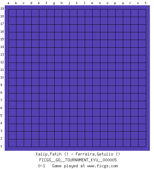 Last move : 0-1 2006 October 12 15:27:43 [Event "FICGS__GO__TOURNAMENT_KYU__000005"] [Site "FICGS"] [Date "2006.10.02"] [Round "1"] [Black "Kalip,Fatih"] [White "Ferreira,Getulio"] [Result "0-1"] 0-1 Here are the names of the openings (joseki) played in the four corners : Player White won this Go (weiqi, baduk) game. Follow this game move after move (download)In an unreasonable situation, an unreasonable move is reasonable. (Tamino) Creativity is allowing yourself to make mistakes. Art is knowing which ones to keep. (Scott Adams)