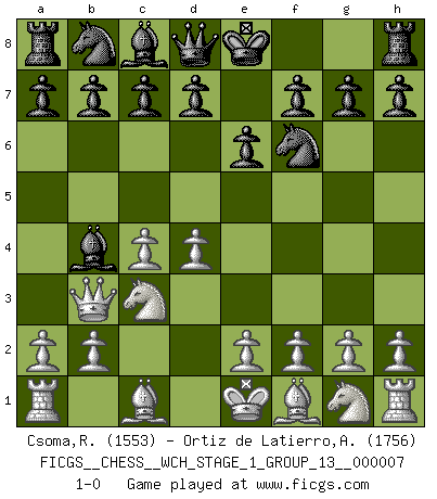 Last move : 1-0 2010 January 2 20:21:34 [Event "FICGS__CHESS__WCH_STAGE_1_GROUP_13__000007"] [Site "FICGS"] [Date "2009.11.17"] [Round "1"] [White "Csoma,Robert"] [Black "Ortiz de Latierro,Aitor"] [Result "1-0"] [WhiteElo "1553"] [BlackElo "1756"] 1.d4 Nf6 2.c4 e6 3.Nc3 Bb4 4.Qb3 1-0 This chess game has been lost on time (started : 2009.11.17 23:7:42) Nimzo-Indian : Spielmann variation Player White won this chess game. Follow this game move after move (download)Chess opens and enriches your mind. (Saudin Robovic) Ohne Fehler kann es keine Brillanz geben. (Emanuel Lasker) Jugadores de primera clase pierden en contra de jugadores de segunda clase porque los jugadores de segunda clase a veces juegan una partida de primer clase. (Siegbert Tarrasch) Si le désir cupide (et stupide) de gagner est une inépuisable source de souffrance, une combinaison brillante sur l'échiquier est une découverte : le coquelicot qui s'épanouit lorsque apparaît la Voie Lactée. (Arrabal) Nobody is always a winner, and anybody who says he is, is either a liar or doesn't play poker. (Amarillo Slim)