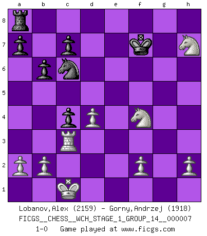 Last move : 1-0 2010 February 27 15:16:58 [Event "FICGS__CHESS__WCH_STAGE_1_GROUP_14__000007"] [Site "FICGS"] [Date "2009.11.17"] [Round "1"] [White "Lobanov,Alex"] [Black "Gorny,Andrzej"] [Result "1-0"] [WhiteElo "2159"] [BlackElo "1918"] 1.d4 e6 2.c4 b6 3.e4 Bb7 4.Bd3 f5 5.exf5 Bxg2 6.Qh5+ g6 7.fxg6 Bg7 8.gxh7 Kf8 9.Bg5 Nf6 10.Qh4 Bxh1 11.Ne2 Nc6 12.Nd2 e5 13.O-O-O e4 14.Bxe4 Bxe4 15.Nxe4 Rxh7 16.Qf4 Kf7 17.Rd3 d5 18.Bxf6 Qxf6 19.Nxf6 Bh6 20.Nxh7 Bxf4+ 21.Nxf4 dxc4 22.Rc3 1-0 Queen's pawn : Keres defense Queenside Castling by player White (move 13) Player White won this chess game. Follow this game move after move (download)Chess is played with the mind and not with the hands ! (Renaud and Kahn) Ich verstehe Aljechins Kombinationen ganz gut; aber woher er diese Angriffschancen bekommt und wie er die Eröffnung behandelt das ist für mich ein Buch mit sieben Siegeln. (Rudolf Spielmann) Evita las multitudes. Haz independientemente tu propio razonamiento. Trata de ser el jugador de Ajedrez, no la pieza de Ajedrez. (Ralph Charell) Demandez au pauvre Cg1 ce qu'il en pense. Eduard Gufeld à propos de la variante Saemisch de l'Est-Indienne. Every now and then a man's mind is stretched by a new idea and never shrinks back to its former dimensions. (Oliver Wendell Holmes, Sr.)