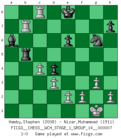 Last move : 1-0 2010 February 21 21:14:58 [Event "FICGS__CHESS__WCH_STAGE_1_GROUP_14__000007"] [Site "FICGS"] [Date "2009.11.02"] [Round "1"] [White "Hamby,Stephen"] [Black "Nizar,Muhammad"] [Result "1-0"] [WhiteElo "2008"] [BlackElo "1911"] 1.Nf3 d5 2.c4 d4 3.g3 c5 4.b4 cxb4 5.a3 e6 6.Bg2 Nc6 7.O-O Nf6 8.d3 Be7 9.axb4 Bxb4 10.Ne5 Qb6 11.Nxc6 bxc6 12.Bd2 Bd7 13.Qb3 Bc5 14.Qxb6 Bxb6 15.Bb4 Rb8 16.Bd6 Rb7 17.Nd2 Kd8 18.Nf3 Bc7 19.Bc5 Bb6 20.Bxb6+ Rxb6 21.Rxa7 c5 22.Ne5 Rf8 23.Rfa1 Rb8 24.Bc6 Bc8 25.R1a5 Rb6 26.Rxc5 Ng8 27.Nxf7+ Rxf7 28.Rxf7 Ne7 29.Bb5 Ng6 30.Rxg7 Ba6 31.Rd7+ Ke8 32.Rb7 Rxb5 33.Rc8+ 1-0 This chess game has been lost on time (started : 2009.11.02 22:36:3) Reti : Advance variation Kingside Castling by player White (move 7) Player White won this chess game. Follow this game move after move (download)I don't believe in psychology. I believe in good moves. (Bobby Fischer) Glücklicherweise sind Großmeister Ruben Fines reine Schachbücher weniger phallozentrisch [als seine Schachpsychologie] und deswegen auch weniger lächerlich. (Nigel Short) Si yo gano un torneo, yo lo gano por mí mismo. Yo hago las jugadas. Nadie me ayuda. (Bobby Fischer) Seul un grand joueur sait à quel point il joue faiblement. (Xavier Tartacover) Never risk one's whole fortune unless supported by one's entire army. (Niccolo Machiavelli)