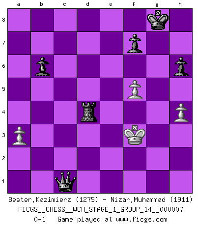 Last move : 0-1 2010 February 8 10:44:46 [Event "FICGS__CHESS__WCH_STAGE_1_GROUP_14__000007"] [Site "FICGS"] [Date "2009.11.02"] [Round "1"] [White "Bester,Kazimierz"] [Black "Nizar,Muhammad"] [Result "0-1"] [WhiteElo "1275"] [BlackElo "1911"] 1.c4 e5 2.Nf3 Nc6 3.d4 exd4 4.Nxd4 Nf6 5.Nf3 Be7 6.Bg5 O-O 7.e3 h6 8.Bh4 d6 9.Nc3 Bg4 10.Be2 Re8 11.O-O Ne4 12.Bxe7 Qxe7 13.Nxe4 Qxe4 14.a3 a5 15.Rc1 Ne5 16.Nxe5 Bxe2 17.Qxe2 Rxe5 18.Rfd1 Rae8 19.Rd4 Qxd4 20.g3 a4 21.Rc3 b6 22.exd4 Rxe2 23.b4 axb3 24.Rxb3 Rc2 25.c5 dxc5 26.dxc5 Rxc5 27.h4 Rc2 28.Rf3 R8e2 29.Kf1 c5 30.g4 c4 31.Kg2 Red2 32.Kg3 Rd3 33.g5 Rxf3+ 34.Kxf3 c3 35.gxh6 gxh6 36.Ke3 Rd2 37.f4 Rd1 38.Ke2 c2 39.f5 c1Q 40.Kf3 Rd4 0-1 English, Nimzovich variation Kingside Castling by player Black (move 6) Kingside Castling by player White (move 11) 10 pieces endgame at move 35 : White KPPP , Black KRPPPP WHITE : King + 3 Pawns BLACK : King + 1 Rook 4 Pawns Promotion Queen by player Black (move 39) Player Black won this chess game. Follow this game move after move (download)As one by one I mowed them down, my superiority soon became apparent. (Jose Capablanca) Wenn ein Kopf und ein Buch zusammenstoßen und es klingt hohl, ist es denn allemal im Buche? (Georg Christoph Lichtenberg) Prefiero perder una partida realmente buena, que ganar una mala. (David Levy) Vous savez, camarade Pachman, je n'éprouve pas de plaisir à être ministre, je jouerais plutôt aux échecs comme vous, ou alors ferais une révolution au Venezuela. (Che Guevara à Ludek Pachman, 'Checkmate in Prague', 1975) I'm extremely disappointed. I send you out for exciting, new designer drugs, you come back with tomato sauce. (Gregory House, House M.D.)