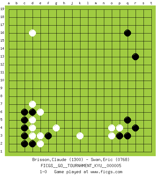 Last move : 1-0 2006 November 21 2:34:34 [Event "FICGS__GO__TOURNAMENT_KYU__000005"] [Site "FICGS"] [Date "2006.10.02"] [Round "1"] [Black "Brisson,Claude"] [White "Swan,Eric"] [Result "1-0"] [Rating 1 "1300"] [Rating 2 "0768"] 1.q16 d4 2.r4 d16 3.f3 k3 4.d6 e6 5.c3 d3 6.c4 d5 7.c5 d7 8.c6 g4 9.d2 e2 10.c2 e3 11.r13 p4 12.p3 o3 13.q3 o4 14.q5 1-0 This go game has been lost on time (started : 2006.10.02 11:48:46) Here are the names of the openings (joseki) played in the four corners : Corner d4 : d4 f3 Hoshi (Hwajeom, Seongjeom, Xingwei`) 4-4 Point. The star or hoshi (4-4) point, emphasizing influence at the potential expense of territory. Ikken Kakari (Hankan Keolch'im, Yi Gua`jiao~, 1-Space Low Approach). Black 2 is the standard approach move to the 4-4. Corner q4 : r4 p4 Komoku (Somok, Xiao~mu`) 3-4 Point. The komoku (3-4) point is the traditional corner enclosure move.. Ikken Takagakari (Hankan Nop'dakeolch'im, Yi Gaogua`jiao~, 1-Space High Approach). The 5-4 approach move has become more popular in modern times, as modern Go emphasizes speed and influence. Player Black won this Go (weiqi, baduk) game. Follow this game move after move (download)Don't count territory held by only one eye. (Anonymous) What doesn't kill us makes us stronger. (Friedrich Nietzsche)