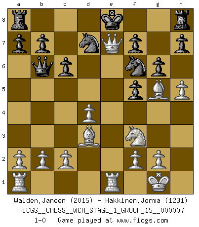 Last move : 1-0 2009 November 26 9:31:56 [Event "FICGS__CHESS__WCH_STAGE_1_GROUP_15__000007"] [Site "FICGS"] [Date "2009.11.02"] [Round "1"] [White "Walden,Janeen"] [Black "Hakkinen,Jorma"] [Result "1-0"] [WhiteElo "2015"] [BlackElo "1231"] 1.e4 c6 2.d4 d5 3.Nc3 dxe4 4.Nxe4 Bf5 5.Ng3 Bg6 6.h4 e6 7.h5 Bf5 8.Nxf5 exf5 9.Nf3 Nf6 10.Bd3 Nbd7 11.O-O Bd6 12.Re1+ Be7 13.Qe2 g6 14.Bg5 Qb6 15.Qxe7+ 1-0 Caro-Kann : Classical, 6.h4 Kingside Castling by player White (move 11) Player White won this chess game. Follow this game move after move (download)Chess is like life. (Boris Spassky) Es tut gut, die Entwicklungsperiode von, [...] demokratischem Geist durchdringen zu lassen. Wie undemokratisch wäre es doch beispielsweise, den einen Offizier große Spaziertouren vornehmen zu lassen, während die anderen zu Hause säßen und sich entsetzlich langweilten. (Aaron Nimzowitsch) La vida es como el Ajedrez, con lucha, competición y eventos buenos y malos. (Benjamin Franklin) Les échecs, c'est l'imagination. (David Bronstein) Optimism is a variety of information deficit. Sometimes especially true for correspondence chess games. (Michael Aigner)
