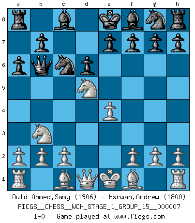 Last move : 1-0 2010 January 14 20:17:22 [Event "FICGS__CHESS__WCH_STAGE_1_GROUP_15__000007"] [Site "FICGS"] [Date "2009.11.02"] [Round "1"] [White "Ould Ahmed,Samy"] [Black "Harwan,Andrew"] [Result "1-0"] [WhiteElo "1906"] [BlackElo "1800"] 1.e4 c5 2.Nf3 Nc6 3.d4 cxd4 4.Nxd4 Qb6 5.Nb3 d6 6.Nc3 a6 7.Nd5 1-0 This chess game has been lost on time (started : 2009.11.02 22:37:15) Sicilian defense Player White won this chess game. Follow this game move after move (download)There is no remorse like the remorse of Chess. (H. G. Wells) Mein Name ist Rustam Kamsky. Sie haben meinen Sohn belästigt. Bereiten Sie sich aufs Sterben vor. (Rustam Kamsky) Yo siempre he tenido un ligero sentimiento de lástima por una persona que no tiene conocimiento del Ajedrez. (Siegbert Tarrasch) À la honte des hommes, on sait que les lois du jeu sont les seules qui soient partout justes, claires, inviolables et exécutées. Pourquoi l'Indien qui a donné les règles du jeu d'échecs est-il obéi de bon gré dans toute la terre, et que les décrétales des papes, par exemple, sont aujourd'hui un objet d'horreur et de mépris ? C'est que l'inventeur des échecs combina tout avec justesse pour la satisfaction des joueurs, et que les papes, dans leurs décrétales, n'eurent en vue que leur seul avantage. L'Indien voulut exercer également l'esprit des hommes et leur donner du plaisir; les papes ont voulu abrutir l'esprit des hommes. Voltaire (Dictionnaire philosophique / Garnier 1967) If only people were all showed a certain minimum level of niceness; if only people didn't retract verbal draw offers (without draw box ticked) on ficgs; if only people didn't kill; if only people didn't run concentration / extermination camps, if only people didn't drop nuclear bombs on Hiroshima and Nagasaki, and so on - it would be a much more beautiful world. But sadly, things are not so... (Normajean Yates)