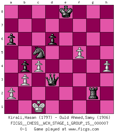 Last move : 0-1 2010 May 7 7:52:7 [Event "FICGS__CHESS__WCH_STAGE_1_GROUP_15__000007"] [Site "FICGS"] [Date "2009.11.17"] [Round "1"] [White "Kirali,Hasan"] [Black "Ould Ahmed,Samy"] [Result "0-1"] [WhiteElo "1797"] [BlackElo "1906"] 1.e4 c5 2.Nf3 d6 3.d4 cxd4 4.Nxd4 Nf6 5.Nc3 a6 6.Bg5 e6 7.f4 Nbd7 8.Qf3 Qc7 9.O-O-O b5 10.Bd3 Bb7 11.Rhe1 Be7 12.Qg3 b4 13.Nd5 exd5 14.exd5 Kd8 15.Nc6+ Bxc6 16.dxc6 Nc5 17.Bh4 Rg8 18.Bxh7 Rh8 19.Qxg7 Rxh7 20.Qxf6 Rxh4 21.Qxf7 Rh8 22.Re5 Na4 23.Re3 Ra7 24.Rde1 Qxc6 25.Rxe7 Rxe7 26.Qxe7+ Kc8 27.h4 Qd5 28.Qe2 Nc5 29.Qg4+ Kd8 30.f5 Rf8 31.Qg8 Rxg8 32.Re8+ Kxe8 33.c4 Qd3 34.b3 Rxg2 0-1 This chess game has been lost on time (started : 2009.11.17 23:4:14) Sicilian : Najdorf, 7.f4 Queenside Castling by player White (move 9) Player Black won this chess game. Follow this game move after move (download)The only thing Chess players have in common is Chess. (Lodewijk Prins) Ich bin Weltmeister und muß mit niemandem irgend etwas diskutieren. (Viswanathan Anand) El Ajedrez es un terrible juego. Si no controlas el centro, tu oponente tiene una posición mas holgada. Si tienes control del centro, ¡entonces realmente tu tienes algo de que preocuparte!. (Siegbert Tarrasch) Ce n'est pas pour s'amuser qu'il joue aux échecs : il célèbre un culte. (Vladimir Nabokov) At last I discovered the true beauty of chess. So I proposed to her. (Dinesh De Silva)
