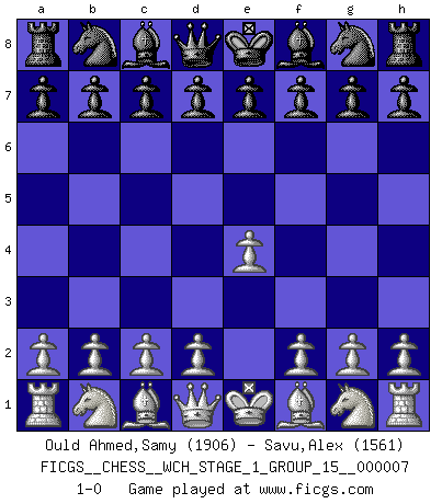 Last move : 1-0 2009 December 10 8:15:30 [Event "FICGS__CHESS__WCH_STAGE_1_GROUP_15__000007"] [Site "FICGS"] [Date "2009.11.02"] [Round "1"] [White "Ould Ahmed,Samy"] [Black "Savu,Alex"] [Result "1-0"] [WhiteElo "1906"] [BlackElo "1561"] 1.e4 1-0 This chess game has been lost on time (started : 2009.11.02 22:37:15) King's pawn Opening Player White won this chess game. Follow this game move after move (download)You can only get good at Chess if you love the game. (Bobby Fischer) Offener Brief an US-Präsident Bush anlässlich der Verhaftung Bobby Fishers: Verhaften Sie mich. Stecken Sie mich in dieselbe Zelle wie Bobby Fisher und geben Sie uns ein Schachspiel mit. (Boris Vassilievich Spassky) Mis oponentes también hacen buenas movidas. A veces yo no tomo esas cosas en consideración. (Bobby Fischer) Votre prénom est 'Tactique', votre deuxième prénom est 'Tactique' et votre nom est 'Tactique'. (Ken Smith) I teach you to lie, cheat and steal, and as soon as my back's turned you wait in line ? (Gregory House, House M.D.)
