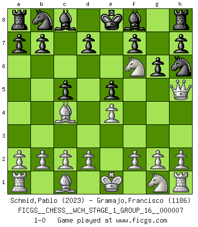 Last move : 1-0 2009 November 8 6:8:36 [Event "FICGS__CHESS__WCH_STAGE_1_GROUP_16__000007"] [Site "FICGS"] [Date "2009.11.02"] [Round "1"] [White "Schmid,Pablo"] [Black "Gramajo,Francisco"] [Result "1-0"] [WhiteElo "2023"] [BlackElo "1186"] 1.e4 e5 2.Bc4 c5 3.Qh5 Qf6 4.Nc3 Nh6 5.Nd5 g6 6.Nxf6+ 1-0 Bishop's Opening Player White won this chess game. Follow this game move after move (download)The chessboard is the world, the pieces are the phenomena of the Universe, the rules of the game are what we call the laws of Nature and the player on the other side is hidden from us. (Thomas Huxley) Ich trinke, ich rauche, ich spiele, ich liebe Frauen aber Fernschach ist ein Laster, das ich nicht habe. (Mikhail Nekhemyevich Tal) Para mi, el Ajedrez es la vida y cada partida es como una nueva vida. Todo jugador de Ajedrez suele vivir muchas vidas durante su vida. (Eduard Gufeld) En blitz, le Cavalier l'emporte sur le Fou. (Vlastimil Hort) The best teachers teach from the heart, not from the book. (Author unknown)