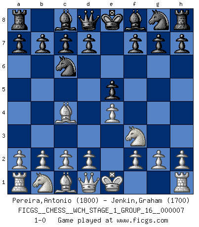 Last move : 1-0 2009 December 13 8:33:46 [Event "FICGS__CHESS__WCH_STAGE_1_GROUP_16__000007"] [Site "FICGS"] [Date "2009.11.02"] [Round "1"] [White "Pereira,Antonio"] [Black "Jenkin,Graham"] [Result "1-0"] [WhiteElo "1800"] [BlackElo "1700"] 1.e4 e5 2.Nf3 Nc6 3.Bc4 1-0 This chess game has been lost on time (started : 2009.11.02 22:38:38) King's pawn game Player White won this chess game. Follow this game move after move (download)The combination player thinks forward; he starts from the given position, and tries the forceful moves in his mind. (Emanuel Lasker) Es ist im Leben wie im Schachspiel. Wir entwerfen einen Plan, dieser bleibt jedoch bedingt durch das, was im Schachspiel dem Gegner, im Leben dem Schicksal zu tun belieben wird. (Arthur Schopenhauer) Con el tiempo, empecé a progresar en partidas decisivas. Tal vez porque me di cuenta de una simple verdad: no solo estaba yo nervioso sino también mi oponente. (Mikhail Tal) Avec des compensations pour le matériel en plus... (Anonyme) Men never do evil so completely and cheerfully as when they do it from religious conviction. (Blaise Pascal)