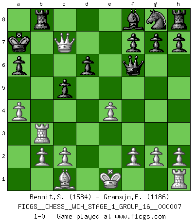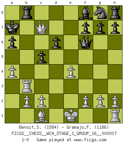 Last move : 1-0 2009 November 18 0:32:28 [Event "FICGS__CHESS__WCH_STAGE_1_GROUP_16__000007"] [Site "FICGS"] [Date "2009.11.02"] [Round "1"] [White "Benoit,Sebastien"] [Black "Gramajo,Francisco"] [Result "1-0"] [WhiteElo "1584"] [BlackElo "1186"] 1.e4 e5 2.Nf3 Nc6 3.d4 exd4 4.Nxd4 Nxd4 5.Qxd4 d6 6.Bc4 c5 7.Qd3 a6 8.a4 Qf6 9.Nc3 Be6 10.Nd5 Bxd5 11.Qxd5 O-O-O 12.Bxa6 bxa6 13.Qc6+ Kb8 14.Ra3 Ka7 15.Rb3 Rb8 16.Qc7+ 1-0 Scotch game Queenside Castling by player Black (move 11) Player White won this chess game. Follow this game move after move (download)Many have become Chess Masters, no one has become the Master of Chess. (Siegbert Tarrasch) Stelle das Brett so, daß die Sonne in die Augen deines Gegners scheint. (Ruy López) Yo siempre he tenido un ligero sentimiento de lástima por una persona que no tiene conocimiento del Ajedrez. (Siegbert Tarrasch) Aux échecs, les retours au sommet sont rares : les dommages psychologiques consécutifs à une défaite sont trop sévères. (Daily Telegraph) Memory... is the diary that we all carry with us. (Oscar Wilde, The Importance of Being Earnest)