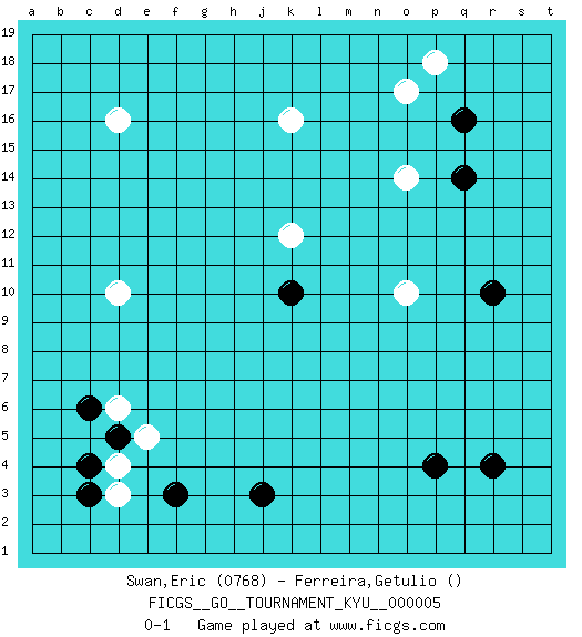 Last move : 0-1 2006 November 21 20:42:54 [Event "FICGS__GO__TOURNAMENT_KYU__000005"] [Site "FICGS"] [Date "2006.10.02"] [Round "1"] [Black "Swan,Eric"] [White "Ferreira,Getulio"] [Result "0-1"] [Rating 1 "0768"] 1.q16 d16 2.r4 d4 3.f3 k16 4.j3 d10 5.p4 o17 6.q14 p18 7.r10 o14 8.k10 k12 9.c6 d6 10.c3 d3 11.c4 o10 12.d5 e5 0-1 This go game has been lost on time (started : 2006.10.02 11:48:46) Here are the names of the openings (joseki) played in the four corners : Corner d4 : d4 f3 Hoshi (Hwajeom, Seongjeom, Xingwei`) 4-4 Point. The star or hoshi (4-4) point, emphasizing influence at the potential expense of territory. Ikken Kakari (Hankan Keolch'im, Yi Gua`jiao~, 1-Space Low Approach). Black 2 is the standard approach move to the 4-4. Corner q16 : q16 o17 Hoshi (Hwajeom, Seongjeom, Xingwei`) 4-4 Point. The star or hoshi (4-4) point, emphasizing influence at the potential expense of territory. Ikken Kakari (Hankan Keolch'im, Yi Gua`jiao~, 1-Space Low Approach). White 2 is the standard approach move to the 4-4. Player White won this Go (weiqi, baduk) game. Follow this game move after move (download)A basic: Don't push too hard. (Jansteen) 98% of all statistics are made up. (Author unknown)