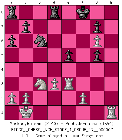 Last move : 1-0 2010 January 30 17:9:50 [Event "FICGS__CHESS__WCH_STAGE_1_GROUP_17__000007"] [Site "FICGS"] [Date "2009.11.02"] [Round "1"] [White "Markus,Roland"] [Black "Pech,Jaroslav"] [Result "1-0"] [WhiteElo "2140"] [BlackElo "1594"] 1.e4 e6 2.d4 d5 3.Nc3 Nf6 4.Bg5 Be7 5.e5 Nfd7 6.h4 c5 7.Bxe7 Kxe7 8.Nf3 cxd4 9.Qxd4 Nc6 10.Qf4 Qc7 11.O-O-O Ndxe5 12.Kb1 Qb8 13.Re1 Nxf3 14.Qxf3 Rd8 15.Nxd5+ Kf8 16.Nc3 a6 17.Qh5 h6 18.g4 Qf4 19.g5 e5 20.Re4 Qf5 21.Bd3 Qg6 22.Qxg6 fxg6 23.Re3 Bf5 24.h5 Bxd3 25.cxd3 hxg5 26.hxg6 1-0 French : Albin-Alekhine-Chatard attack, Breyer variation Queenside Castling by player White (move 11) Player White won this chess game. Follow this game move after move (download)Up to this point White has been following well-known analysis. But now he makes a fatal error: he begins to use his own head. (Siegbert Tarrasch) Ich würde mich als ganz normalen Jungen bezeichnen [Im Alter von 12]. (Sergej Karjakin) El Ajedrez es una manera fabulosa para que los niños aprendan a autovalorarse y a autoestimarse. (Saudin Robovic) Les Cavaliers se révèlent fort utiles dans les positions fermées. D'habitude, les Fous sont un peu plus forts que les Cavaliers dans les positions ouvertes. Qu'on le veuille ou non, il restera toujours des exceptions ! Patience, use the Force, think ! (Obi-Wan Kenobi in Star Wars ep.2)