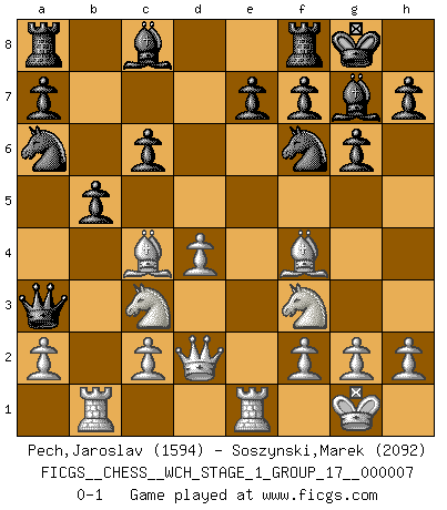 Last move : 0-1 2010 January 8 20:36:6 [Event "FICGS__CHESS__WCH_STAGE_1_GROUP_17__000007"] [Site "FICGS"] [Date "2009.11.17"] [Round "1"] [White "Pech,Jaroslav"] [Black "Soszynski,Marek"] [Result "0-1"] [WhiteElo "1594"] [BlackElo "2092"] 1.e4 d5 2.exd5 Qxd5 3.Nc3 Qd6 4.d4 Nf6 5.Nf3 g6 6.Bc4 Bg7 7.O-O O-O 8.Nb5 Qb6 9.Bf4 Na6 10.Re1 c6 11.Nc3 Qxb2 12.Qd2 Qa3 13.Rab1 b5 0-1 This chess game has been lost on time (started : 2009.11.17 23:2:10) Scandinavian : Pytel-Wade variation Kingside Castling by player White (move 7) Kingside Castling by player Black (move 7) Player Black won this chess game. Follow this game move after move (download)One of these modest little moves may be more embarrassing to your opponent than the biggest threat. (Siegbert Tarrasch) Modernes Schach erfordert enorme Anspannung. Es ist für einen normalen Menschen unmöglich das auszuhalten. (Viktor Kortschnoi) Cuando tu no sabes absolutamente que mas hacer, es tiempo de entrar en pánico. (John van der Wiel) Je crois qu'il existe des manières très spécifiques de jouer efficacement contre une machine. Evidemment, nous n'avons aucune chance en technique pure, parce que l'ordinateur calcule de manière parfaite. Mais lorsque nous faisons appel à notre cerveau, en utilisant l'intuition et la compréhension, alors nous restons beaucoup plus forts. (Anatoli Karpov) 98% of all statistics are made up. (Author unknown)