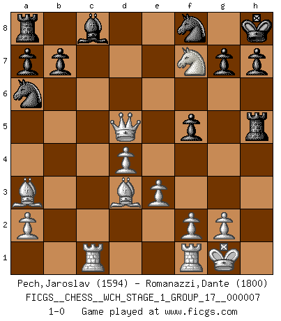 Last move : 1-0 2010 February 10 16:43:57 [Event "FICGS__CHESS__WCH_STAGE_1_GROUP_17__000007"] [Site "FICGS"] [Date "2009.11.02"] [Round "1"] [White "Pech,Jaroslav"] [Black "Romanazzi,Dante"] [Result "1-0"] [WhiteElo "1594"] [BlackElo "1800"] 1.d4 d5 2.c4 c6 3.Nf3 e6 4.Nc3 Bb4 5.Qb3 Bxc3+ 6.bxc3 Ne7 7.e3 f6 8.Bd3 O-O 9.O-O f5 10.Ba3 Rf6 11.Qb4 Ng6 12.h4 Na6 13.Qb3 Rf7 14.h5 Nf8 15.cxd5 cxd5 16.c4 Kh8 17.Ne5 Rf6 18.cxd5 exd5 19.Rac1 Rh6 20.Nf7+ Kg8 21.Nxd8 Rxh5 22.Qxd5+ Kh8 23.Nf7+ 1-0 QGD Slav : 3.Nf3 Kingside Castling by player Black (move 8) Kingside Castling by player White (move 9) Player White won this chess game. Follow this game move after move (download)The beauty of a move lies not in its' appearance but in the thought behind it. (Siegbert Tarrasch) Um dein Spiel zu verbessern musst du zuallererst das Endspiel studieren, denn diese kann unabhängig studiert werden. Die Eröffnung und das Mittelspiel müssen immer in Bezug gesetzt werden zum Endspiel. (José Raúl Capablanca) Fischer no está bajo la obligación de nadie. (Joseph Platz) Les pièces de l'échiquier étaient impitoyables. Elles le retenaient, elles l'absorbaient. Il y avait de l'horreur en cela, mais aussi une harmonie unique. Car, qu'y a-t-il dans le monde, à part les échecs ? (V. Nabokov) The good fighters of old first put themselves beyond the possibility of defeat, and then waited for an opportunity of defeating the enemy. (Sun Tzu)