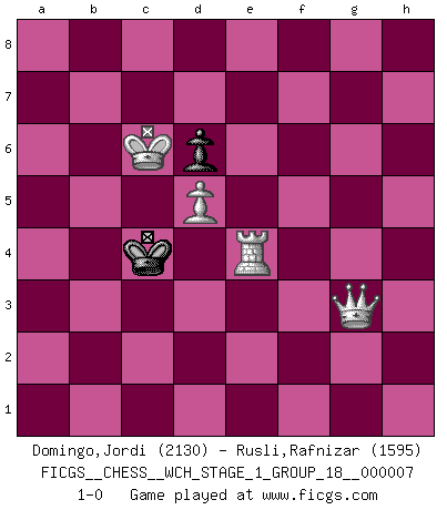 Last move : 1-0 2010 March 8 9:39:33 [Event "FICGS__CHESS__WCH_STAGE_1_GROUP_18__000007"] [Site "FICGS"] [Date "2009.11.02"] [Round "1"] [White "Domingo,Jordi"] [Black "Rusli,Rafnizar"] [Result "1-0"] [WhiteElo "2130"] [BlackElo "1595"] 1.e4 c5 2.Nf3 d6 3.d4 cxd4 4.Nxd4 Nf6 5.Nc3 a6 6.Be3 e5 7.Nb3 Be6 8.f3 Be7 9.Qd2 Nbd7 10.g4 Nb6 11.O-O-O Nc4 12.Bxc4 Bxc4 13.Kb1 b5 14.g5 Nd7 15.Nd5 Bxd5 16.Qxd5 O-O 17.h4 Nb6 18.Bxb6 Qxb6 19.f4 exf4 20.Rhf1 Rae8 21.Rxf4 Bd8 22.a3 g6 23.Rd3 Qc7 24.Rc3 Qb6 25.Rcf3 Qc7 26.Rc3 Re5 27.Rxc7 Rxd5 28.exd5 Bxc7 29.c4 Bb6 30.Rf6 Rd8 31.Kc2 bxc4 32.Nd2 Bd4 33.Rf4 Be3 34.Rxc4 Bxd2 35.Kxd2 Rb8 36.b4 Rb5 37.Rd4 a5 38.a4 Rb8 39.b5 Rc8 40.Rd3 Rc4 41.Rb3 Rc7 42.b6 Rb7 43.Kc3 Kg7 44.Kc4 f6 45.Kb5 fxg5 46.hxg5 h6 47.gxh6+ Kxh6 48.Kxa5 g5 49.Ka6 Rb8 50.Ka7 Rg8 51.b7 g4 52.b8Q Rxb8 53.Kxb8 Kh5 54.a5 Kh4 55.a6 g3 56.a7 g2 57.Rb1 Kh3 58.a8Q Kh2 59.Kc7 g1Q 60.Qh8+ Kg2 61.Qg7+ Kf3 62.Qxg1 Ke4 63.Re1+ Kd3 64.Qg3+ Kd4 65.Kc6 Kc4 66.Re4+ 1-0 This chess game has been lost on time (started : 2009.11.02 22:41:41) Sicilian : Najdorf, Byrne (English) attack Queenside Castling by player White (move 11) Kingside Castling by player Black (move 16) 10 pieces endgame at move 47 : White KRPPP , Black KRPPP WHITE : King + 1 Rook 3 Pawns BLACK : King + 1 Rook 3 Pawns 9 pieces endgame at move 48 : White KRPPP , Black KRPP WHITE : King + 1 Rook 3 Pawns BLACK : King + 1 Rook 2 Pawns Promotion Queen by player White (move 52) 8 pieces endgame at move 52 : White KRPP , Black KRPP WHITE : King + 1 Rook 2 Pawns BLACK : King + 1 Rook 2 Pawns 7 pieces endgame at move 53 : White KRPP , Black KPP WHITE : King + 1 Rook 2 Pawns BLACK : King + 2 Pawns Promotion Queen by player White (move 58) Promotion Queen by player Black (move 59) 6 pieces endgame at move 62 : White KQRP , Black KP WHITE : King + 1 Queen 1 Rook 1 Pawn BLACK : King + 1 Pawn Player White won this chess game. Follow this game move after move (download)I have always a slight feeling of pity for the man who has no knowledge of Chess. (Siegbert Tarrasch) Obendrein hat der FIDE-Präsident den Revolutionsführer Gaddafi zum »Großmeister« ernannt, am Ende der WM. Das ist lächerlich! (Joel Lautier) La belleza de un movimiento no se refleja solo en su apariencia, sino en el pensamiento detrás de él. (Siegbert Tarrasch) Psychologiquement, tu dois avoir confiance en toi même, mais cette confiance doit être basée sur des faits. (Robert Fischer) The intuitive mind is a sacred gift; the rational mind is a faithful servant. We have created a society that honors the servant but has forgotten the gift. (Albert Einstein)