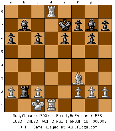 Last move : 0-1 2010 February 21 21:14:58 [Event "FICGS__CHESS__WCH_STAGE_1_GROUP_18__000007"] [Site "FICGS"] [Date "2009.11.17"] [Round "1"] [White "Aah,Ahsan"] [Black "Rusli,Rafnizar"] [Result "0-1"] [WhiteElo "1900"] [BlackElo "1595"] 1.e4 c5 2.d3 Nc6 3.Nc3 g6 4.Be3 d6 5.Be2 Bg7 6.Qd2 a6 7.Nf3 e6 8.d4 cxd4 9.Nxd4 Nge7 10.O-O-O d5 11.exd5 Nxd5 12.Nxd5 Qxd5 13.Nxc6 bxc6 14.Bf3 Qxd2+ 15.Rxd2 Bb7 16.Rhd1 O-O 17.Rd7 Rab8 18.Ba7 Bc8 19.R7d3 Rxb2 20.Bc5 Bb7 21.Bxf8 Kxf8 22.Rd8+ Ke7 0-1 This chess game has been lost on time (started : 2009.11.17 23:0:0) Sicilian defense Queenside Castling by player White (move 10) Kingside Castling by player Black (move 16) Player Black won this chess game. Follow this game move after move (download)Chess is a part of culture and if a culture is declining then Chess too will decline. (Mikhail Botvinnik) Das Schachspiel hat wie die Liebe, die Musik, die Fähigkeit, den Menschen glücklich zu machen. Ich habe ein leises Gefühl des Bedauerns für jeden, der das Schachspiel nicht kennt, so wie ich jeden bedaure, der die Liebe nicht kennt. (Siegbert Tarrasch) El sobresalir en el Ajedrez es un signo de una mente intrigante. (Sir Arthur Conan Doyle) Les échecs sont utiles à l'exercice de la faculté de penser et à celle de l'imagination. Car nous devons posséder une méthode élaborée pour atteindre des buts partout où nous devons conduire notre raison. (Leibnitz) A specialist learns more and more about less and less until he knows everything about nothing. (Nicholas Murray Butler)
