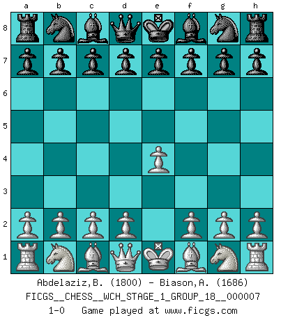 Last move : 1-0 2009 December 8 21:30:42 [Event "FICGS__CHESS__WCH_STAGE_1_GROUP_18__000007"] [Site "FICGS"] [Date "2009.11.02"] [Round "1"] [White "Abdelaziz,Bouhamed"] [Black "Biason,Adriano"] [Result "1-0"] [WhiteElo "1800"] [BlackElo "1686"] 1.e4 1-0 This chess game has been lost on time (started : 2009.11.02 22:41:41) King's pawn Opening Player White won this chess game. Follow this game move after move (download)The King is a fighting piece. Use it ! (Wilhelm Steinitz) Die größte Kunst beim Schach besteht darin dem Gegner nicht zu zeigen was er tun kann. (Garry Kasparov) La maestría del Ajedrez consiste esencialmente en analizar posiciónes de Ajedrez con precisión. (Mikhail Botvinnik) Les pièces de l'échiquier étaient impitoyables. Elles le retenaient, elles l'absorbaient. Il y avait de l'horreur en cela, mais aussi une harmonie unique. Car, qu'y a-t-il dans le monde, à part les échecs ? (V. Nabokov) You have to believe in yourself. (Sun Tzu)