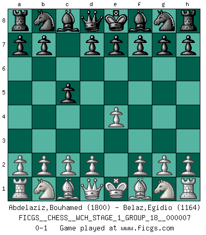 Last move : 0-1 2009 December 4 8:56:40 [Event "FICGS__CHESS__WCH_STAGE_1_GROUP_18__000007"] [Site "FICGS"] [Date "2009.11.02"] [Round "1"] [White "Abdelaziz,Bouhamed"] [Black "Belaz,Egidio"] [Result "0-1"] [WhiteElo "1800"] [BlackElo "1164"] 1.e4 c5 0-1 This chess game has been lost on time (started : 2009.11.02 22:41:41) Sicilian defense Player Black won this chess game. Follow this game move after move (download)You cannot play at Chess if you are kind-hearted. (French Proverb) Darum geht es im Schach. Einen Tag gibst du deinem Gegner eine Lektion, am nächsten Tag gibt er dir eine. (Robert James Fischer) Un Peón pasado es un criminal, quién debe ser mantenido bajo candado y llave. Leves medidas, tales como vigilancia policiaca, no son suficientes. (Aaron Nimzovich) Il s'avisa de me proposer d'apprendre les échecs qu'il jouait un peu... me voilà forcené des échecs. J'achète un échiquier, je m'enferme dans ma chambre, j'y passe des jours et des nuits à vouloir apprendre par cur toutes les parties. (Jean-Jacques Rousseau, Confessions) In fact if nothing is done against this teddy bear, hereby I announce that I would quit chess, rapid chess, blitz chess, postal chess, email chess, server chess and correspondence chess I will then switch to a table game where teddy bears aren't going to be seen for a while, like Poker, or Roulette, all 18+ games. (Elmer Valderrama)