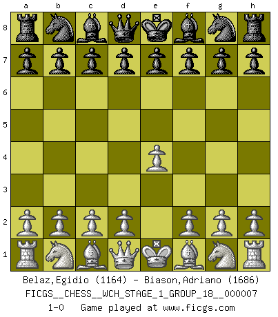 Last move : 1-0 2009 December 3 20:53:45 [Event "FICGS__CHESS__WCH_STAGE_1_GROUP_18__000007"] [Site "FICGS"] [Date "2009.11.02"] [Round "1"] [White "Belaz,Egidio"] [Black "Biason,Adriano"] [Result "1-0"] [WhiteElo "1164"] [BlackElo "1686"] 1.e4 1-0 This chess game has been lost on time (started : 2009.11.02 22:41:41) King's pawn Opening Player White won this chess game. Follow this game move after move (download)Fischer is an American Chess tragedy on par with Morphy and Pillsbury. (Mig Greengard) Oft bringt ein stiller Zug das Erdbeben. (Richard Reti) Dios mío, Bobby Fischer juega tan simple. (Alexei Suetin) Les Echecs sont affaire de jugement sensible. Savoir quand frapper et quand esquiver. (Fischer) My poor ole parrot... Is not in the circulation of displays ....poo hoo hoo :) (Wayne Lowrance's enigma)