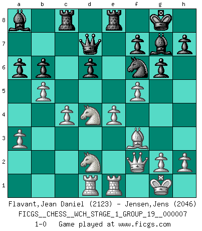 Last move : 1-0 2010 March 1 9:34:51 [Event "FICGS__CHESS__WCH_STAGE_1_GROUP_19__000007"] [Site "FICGS"] [Date "2009.11.02"] [Round "1"] [White "Flavant,Jean Daniel"] [Black "Jensen,Jens"] [Result "1-0"] [WhiteElo "2123"] [BlackElo "2046"] 1.Nf3 c5 2.c4 Nc6 3.Nc3 Nf6 4.d4 cxd4 5.Nxd4 e6 6.a3 Bc5 7.Nb3 Be7 8.e4 O-O 9.Be2 b6 10.O-O Bb7 11.Be3 Rc8 12.f4 d6 13.Qd3 Qd7 14.Bf3 Rfd8 15.Rac1 g6 16.Nd2 Bf8 17.b4 Bg7 18.Rfe1 Ba8 19.Rcd1 e5 20.f5 Nd4 21.Bxd4 exd4 22.Nb5 a6 23.Nxd4 Qc7 24.Qe3 Re8 25.Qf2 Qd7 26.b5 1-0 This chess game has been lost on time (started : 2009.11.02 22:43:11) Reti Opening Kingside Castling by player Black (move 8) Kingside Castling by player White (move 10) Player White won this chess game. Follow this game move after move (download)I feel as if I were a piece in a game of Chess, when my opponent says of it: That piece cannot be moved. (Soren Kierkegaard) Wer nie einen Fehler gemacht hat, hat nie etwas Neues ausprobiert. (Albert Einstein) Si pudieramos observar el interior de la cabeza de un jugador de Ajedrez, encontraríamos ahí un mundo lleno de sentimientos, imágenes, ideas, emoción y pasión. (Alfred Binet) Pour moi, les échecs ne sont pas un jeu mais un art. (Alexandre Alekhine) You know what they say : You lie down with the Devil, you wake up in Hell. (Horatio Caine, C.S.I. Miami)