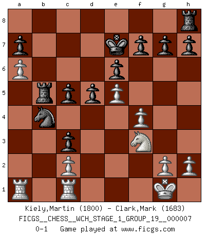 Last move : 0-1 2010 January 19 20:19:18 [Event "FICGS__CHESS__WCH_STAGE_1_GROUP_19__000007"] [Site "FICGS"] [Date "2009.11.17"] [Round "1"] [White "Kiely,Martin"] [Black "Clark,Mark"] [Result "0-1"] [WhiteElo "1800"] [BlackElo "1683"] 1.d4 e6 2.e4 d5 3.Nc3 Bb4 4.Bd2 Bxc3 5.Bxc3 Nf6 6.e5 Ne4 7.f3 Nxc3 8.bxc3 c5 9.Bb5+ Bd7 10.Be2 Qa5 11.Qd2 Nc6 12.f4 cxd4 13.Nf3 dxc3 14.Qe3 Qb4 15.O-O b6 16.a3 Qc5 17.Qxc5 bxc5 18.a4 Nb4 19.Rfc1 Ke7 20.a5 Rab8 21.a6 Bb5 22.Bxb5 Rxb5 0-1 This chess game has been lost on time (started : 2009.11.17 22:57:51) Queen's pawn Kingside Castling by player White (move 15) Player Black won this chess game. Follow this game move after move (download)Bobby Fischer is the greatest Chess player who has ever lived. (Ken Smith) Zum Sieg gelangt man nicht, wenn man gut, sondern nur wenn man besser spielt (Savielly Grigorievitsch Tartakower) En partidas rápidas, el Caballo es mas poderoso que el Alfil. (Vlastimil Hort) Le thème de l'attaque double intervient d'une manière ou d'une autre dans l'immense majorité des combinaisons. (Youri Averbakh) Experience is the name we all give to our mistakes. (Oscar Wilde)