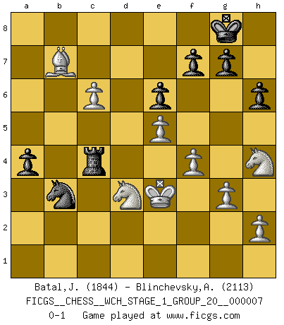 Last move : 0-1 2010 March 2 1:15:55 [Event "FICGS__CHESS__WCH_STAGE_1_GROUP_20__000007"] [Site "FICGS"] [Date "2009.11.02"] [Round "1"] [White "Batal,Jean"] [Black "Blinchevsky,Alexander"] [Result "0-1"] [WhiteElo "1844"] [BlackElo "2113"] 1.Nf3 d5 2.g3 Nf6 3.Bg2 c6 4.O-O Bf5 5.d3 Nbd7 6.Nbd2 e6 7.b3 Bc5 8.Bb2 O-O 9.Qe1 Qb6 10.e4 Bg6 11.Qe2 h6 12.e5 Ne8 13.Nh4 Bh7 14.Kh1 Bd4 15.Bxd4 Qxd4 16.f4 a5 17.Ndf3 Qc3 18.a4 Nc7 19.Bh3 d4 20.Qf2 c5 21.Qd2 Nd5 22.Qxc3 dxc3 23.Rae1 Nb4 24.Rf2 c4 25.bxc4 Bxd3 26.cxd3 Nxd3 27.Rc2 Nxe1 28.Nxe1 Nc5 29.Rxc3 Nxa4 30.Ra3 Nb2 31.c5 Rfd8 32.Kg1 a4 33.Bg2 Rd1 34.Kf2 Nc4 35.Ra2 Rd2+ 36.Rxd2 Nxd2 37.Bxb7 Ra5 38.Ke3 Nb3 39.c6 Rc5 40.Nd3 Rc4 0-1 Reti : King's Indian attack (Barcza system) Kingside Castling by player White (move 4) Kingside Castling by player Black (move 8) Player Black won this chess game. Follow this game move after move (download)The boy (then a 12 year old boy named Anatoly Karpov) doesn't have a clue about Chess, and there's no future at all for him in this profession. (Mikhail Botvinnik) Bis jetzt ist Weiß einer wohlbekannten Analyse gefolgt. Aber jetzt begeht er einen schrecklichen Fehler: Er beginnt seinen eigenen Kopf zu benutzen. (Siegbert Tarrasch) Un mal día en el Ajedrez, es mejor que cualquier buen día en el trabajo. (Anonymous) On n'a jamais que l'âge auquel on a commence à jouer aux échecs car après on cesse de vieillir. (Capablanca) Looking at the proliferation of personal web pages on the Net, it looks like very soon everyone on Earth will have 15 megabytes of fame. (M.G. Sriram)
