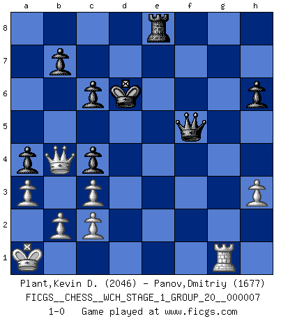 Last move : 1-0 2010 February 16 21:15:15 [Event "FICGS__CHESS__WCH_STAGE_1_GROUP_20__000007"] [Site "FICGS"] [Date "2009.11.02"] [Round "1"] [White "Plant,Kevin D."] [Black "Panov,Dmitriy"] [Result "1-0"] [WhiteElo "2046"] [BlackElo "1677"] 1.e4 e5 2.Nf3 Nf6 3.Nxe5 d6 4.Nf3 Nxe4 5.Nc3 Nxc3 6.dxc3 Be7 7.Bf4 O-O 8.Qd2 Nc6 9.O-O-O Be6 10.Bd3 Qd7 11.Kb1 Rfe8 12.Rhe1 a5 13.h3 a4 14.a3 Na5 15.Bg5 Bf8 16.Nd4 Nc4 17.Qc1 Bd5 18.Bf5 Be6 19.Nxe6 fxe6 20.Bd3 Qb5 21.Re4 d5 22.Bxc4 dxc4 23.Ka1 Ra6 24.Rde1 Bc5 25.Be3 Rd6 26.f4 Qc6 27.Bxc5 Qxc5 28.g4 Kf7 29.f5 e5 30.Qg5 Kf8 31.Qh4 h6 32.g5 hxg5 33.Qxg5 Rh6 34.Rd1 Qe7 35.Qg2 Qf7 36.Rg4 c6 37.Rg6 e4 38.Rxh6 gxh6 39.Rg1 Ke7 40.Qxe4+ Kd6 41.Qd4+ Qd5 42.Qb6 Qxf5 43.Qb4+ 1-0 Petrov : Nimzovich attack Kingside Castling by player Black (move 7) Queenside Castling by player White (move 9) Player White won this chess game. Follow this game move after move (download)Chess is ruthless: you've got to be prepared to kill people. (Nigel Short) Es genügt nicht ein guter Spieler zu sein, man muß auch gut spielen. (Siegbert Tarrasch) Un buen sacrificio es aquel que aunque no sea necesariamente sólido, deja a tu oponente aturdido y confuso. (Rudolph Spielmann) Aux échecs, l'amour-propre est satisfait quand on remporte la victoire, mais il n'y a pas de honte à être battu. (Benjamin Franklin) The modern world has divided itself into Conservatives and Progressives. The business of Progressives is to go on making mistakes. The business of the Conservatives is to prevent the mistakes from being corrected. (G.K. Chesterton)